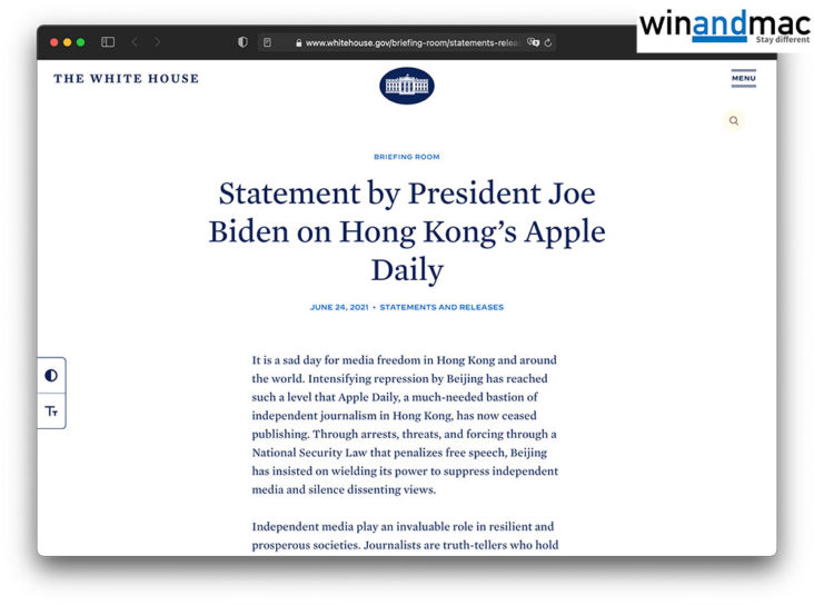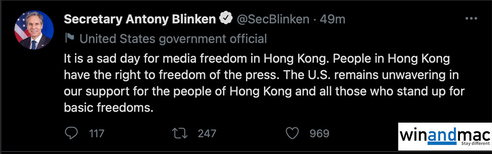 台灣總統蔡英文算是首批談及香港蘋果日報被政府取締的事件,數小時前,美國總統拜登也發表聲明,指蘋果日報關閉是香港新聞自由與全球傷心的日子。聲明中提到,北京打壓愈來愈緊逼,逼到蘋果日報這份香港需要的獨立傳媒的堡壘,也要停刊。北京透過國安法拘捕、恐嚇打壓言論自由,北京堅持行駛其權力,打低獨立媒體和異見分子。
