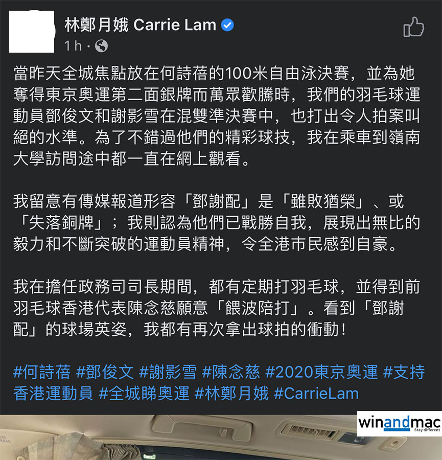 林鄭月娥最後提到自己也愛羽毛球,指在擔任政務司司長期間,都有定期打羽毛球。最後更提到看完這場比賽直播中「鄧謝配」的球場英姿,寫道「我都有再次拿出球拍的衝動!」。