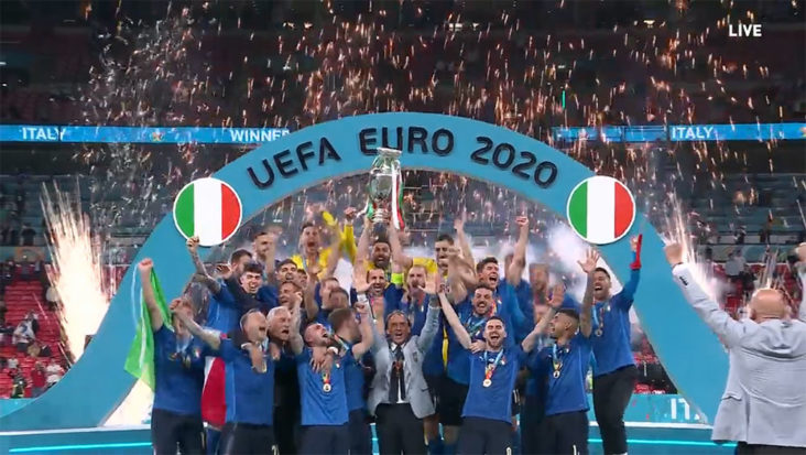 55年後首次晉身國際性足球大賽決賽的英格蘭,於當地時間星期日晚8:00pm,在倫敦溫布萊球場與意大利對決。一開波兩分鐘左右,就由英格蘭的Luke Shaw撞射入網。英國人即時慶祝,從英國電視畫面看到情況相當瘋狂。可惜的是,下半場一次意大利開出角球時,一陣混亂之下由意大利的Leonardo Bonucci於67分鐘成功幫意大利追回1:1。