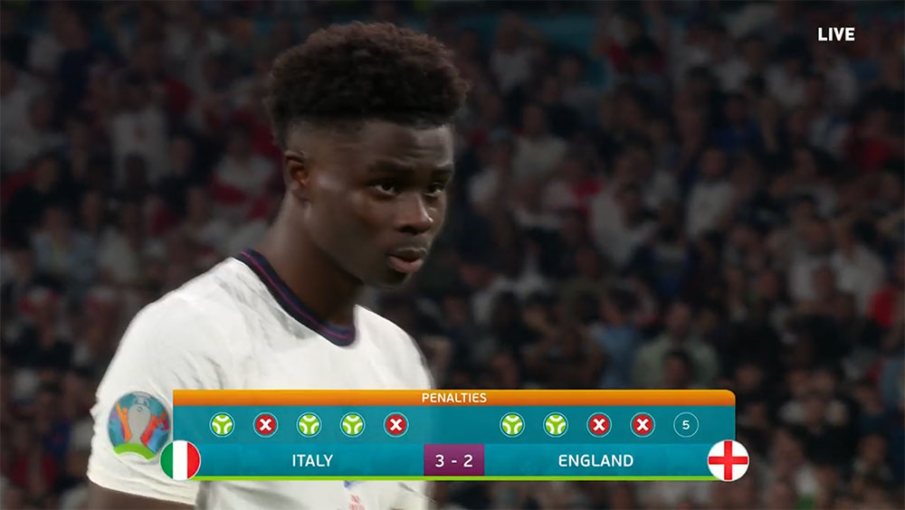 意大利在最後一球12碼成功被英格蘭救到,本來因此英格蘭仍有機會勝出,可惜英格蘭派出年僅19歲的Bukayo Saka(下圖)負責最後一球12碼,最終他在這個關鍵決勝球射失,被意大利門將Gianluigi Donnarumma救到。結果,由意大利成功獲得今屆2020歐國盃冠軍。