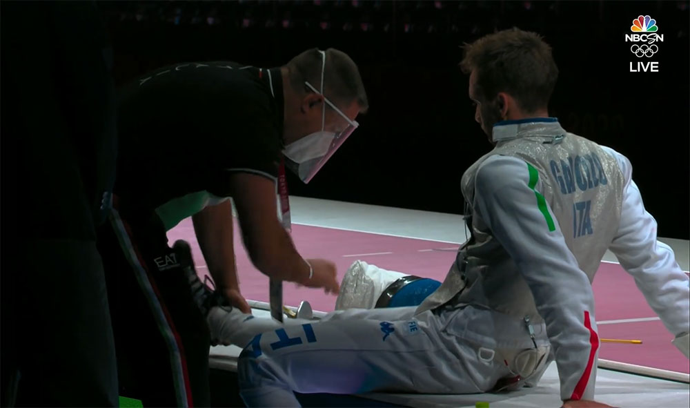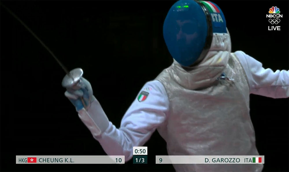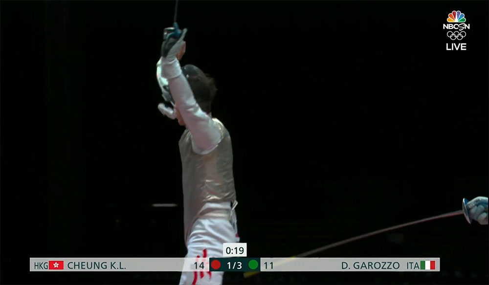 意大利選手D. Garozzo在6:5時,一度懷疑大腿抽筋,向裁判團要求進行醫療支援,比賽曾一度暫停。擁有不少經驗的Garozzo其實曾多次逼近張家朗,比數曾追近至10:9,唯張家朗似乎信心十足。