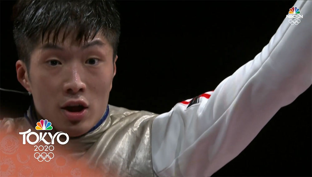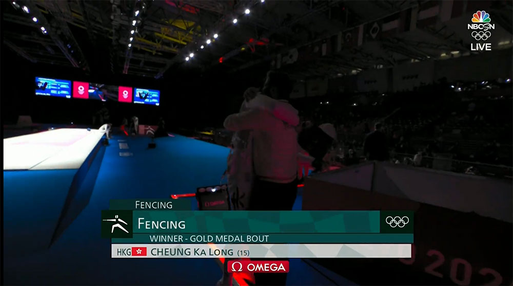 香港代表隊於東京奧運首面金牌在男子花劍項目中誕生,身高193的24歲「劍神」張家朗在決賽,以15:11成功擊敗28歲意大利選手D. Garozzo。張家朗在整場表現穩定和冷靜,雖然曾一度被Garozzo幾乎追平,但張家朗在14:11時仍然沉著迎戰,再一次進攻後,由裁判最後確定張家朗獲得分數,香港正式贏得東京奧運第一面金牌。