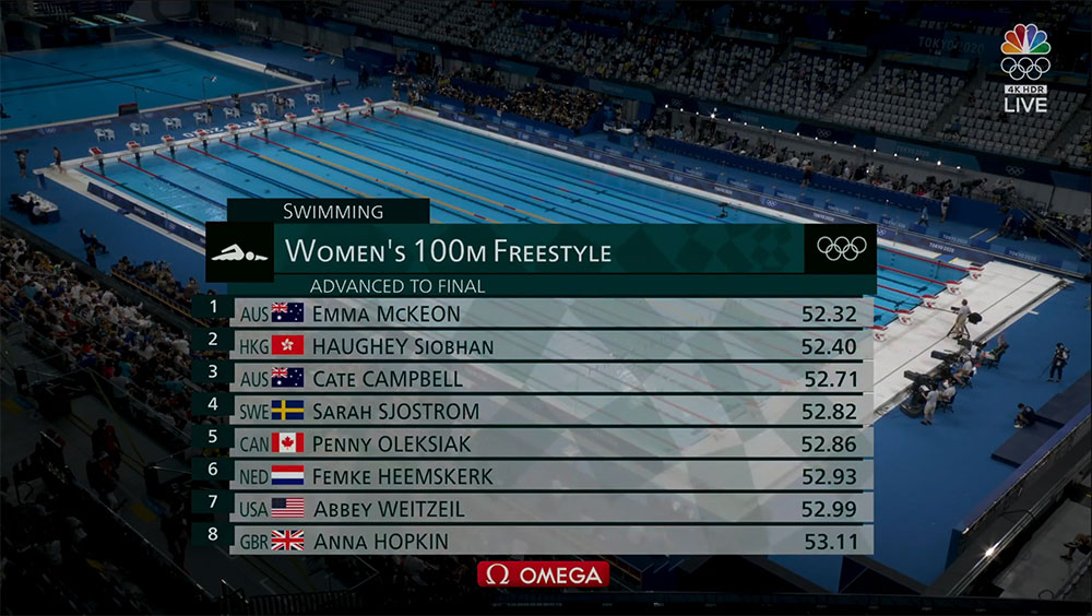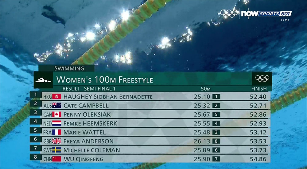 早前才替香港在東京奧運女子200米自由泳中獲取銀牌的何詩蓓,今天參加100米自由泳中,以52秒40該組第一名順利進入決賽,同時亦再次打破亞洲紀錄。其後第二組準決賽賽事中,澳洲Emma McKeon成績則為52秒32,比何詩蓓快0.08秒,即排首位進入決賽,何詩蓓算是排第二名進入決賽。中國則無緣進入決賽。