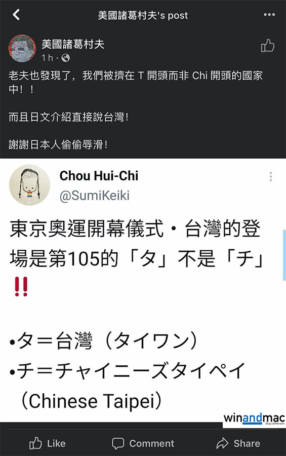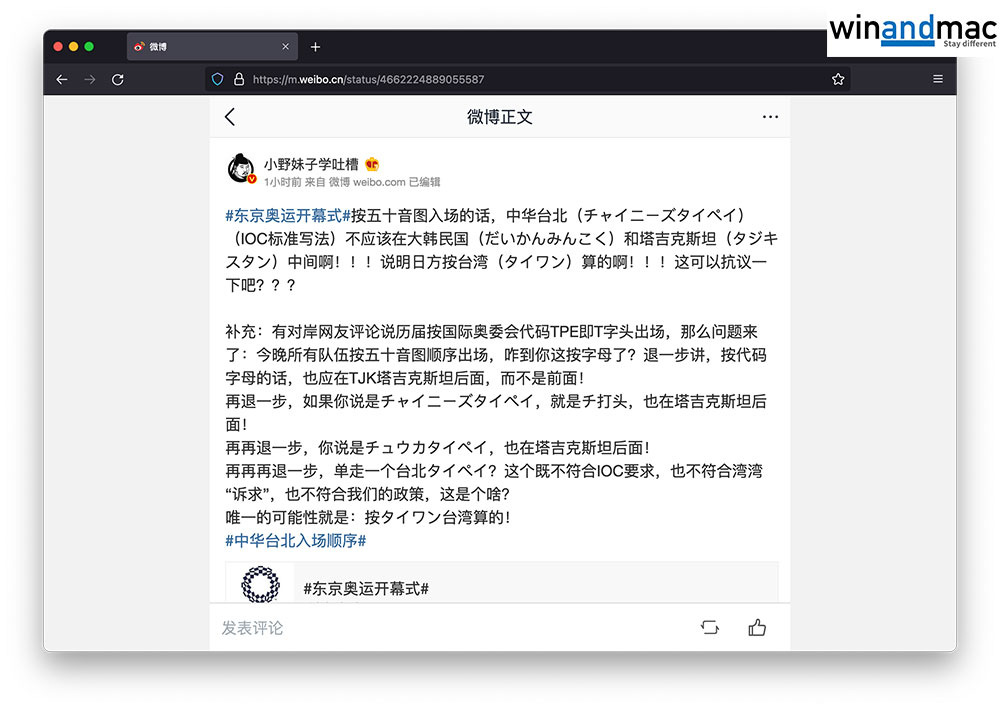 中日關係其實近日已經明顯轉差,再加上日本主動在疫苗上幫助台灣,令中方相當不滿。沒想到今天日本東京奧運開幕儀式,被大陸網民發現日本排國家出場次序時,暗地裏以「台灣」排次序。winandmac記者也有收看直播,可以清楚聽到日本當地無論英文或日文,都是叫「CHINESE TAIPEI」。事實上,無論大陸或台灣網民都發現,日本雖然無講「台灣」一字,但其實日本靜靜雞使用「台灣」作排序。