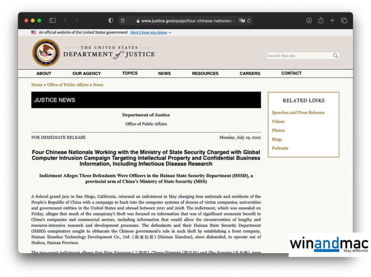 美國反應最激烈,美國稱中國國家軍方使用合約黑客去發動攻擊,又指中國軍方直接與黑客合作去進行有關行動。美國更於當地時間星期一,針對4位為中國國安部服務的黑客進行起訴,並指他們為了掩蔽中國政府在網絡攻擊中的角色,中國海南國安廳還特別成立海南仙盾科技開發有限公司,以便作為掩護。美國亦知道,中國目的是為了偷取對國企等有利的資料,省卻開發時間和成本,為了自己的個人利益去做。