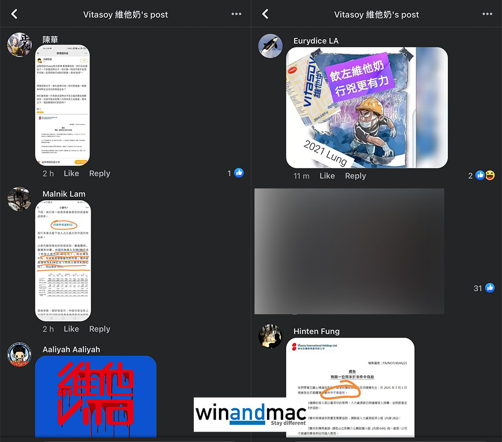 有不知名藝人突然與維他奶割席,大陸網民則針對著維他奶在大陸的業積質疑為何支持「暴徒」,亦有大量藍絲稱事件不是「不幸」,指維他奶公司有「立場」。大陸網民在微博自行發表文章討論更熱烈,聲言要杯葛。不過,大陸網民早前聲言要杯葛的澳洲龍蝦,其後有報道懷疑大陸人靠香港大量輸入,再轉運到大陸。