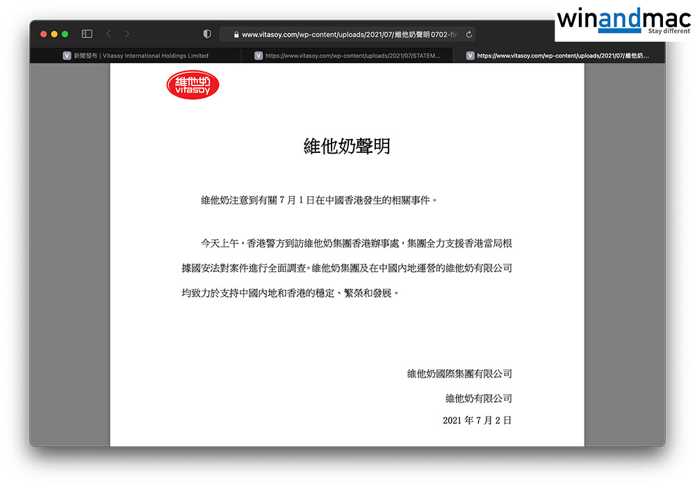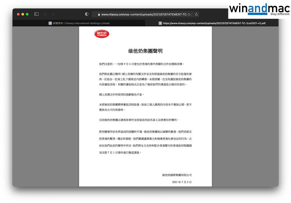 其實,維他奶在7月2日的時候,也有發佈聲明,與中國公司發出的聲明內容類似。