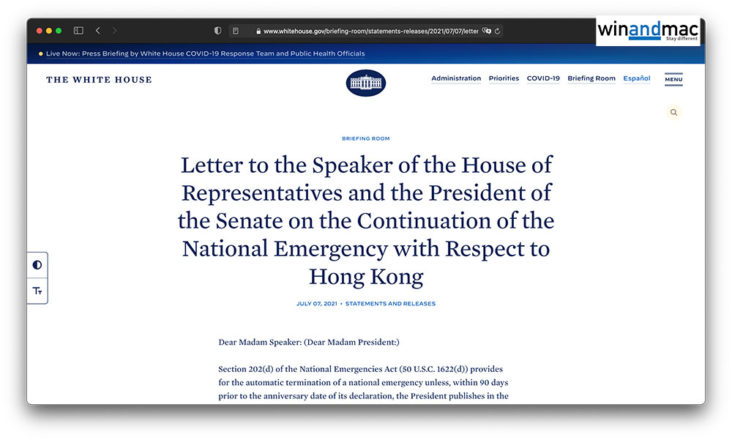 美國總統拜登於當地時間7日,發佈通知宣佈對香港的國家緊急狀態延續多一年,亦即前朝特朗普政府的行政命令13936,2021年7月14日後仍然有效。拜登在通知中表明,中共政府對香港的高度自治進行根本性破壞,以及繼續對美國國家安全、外交政策和經濟構成威脅。