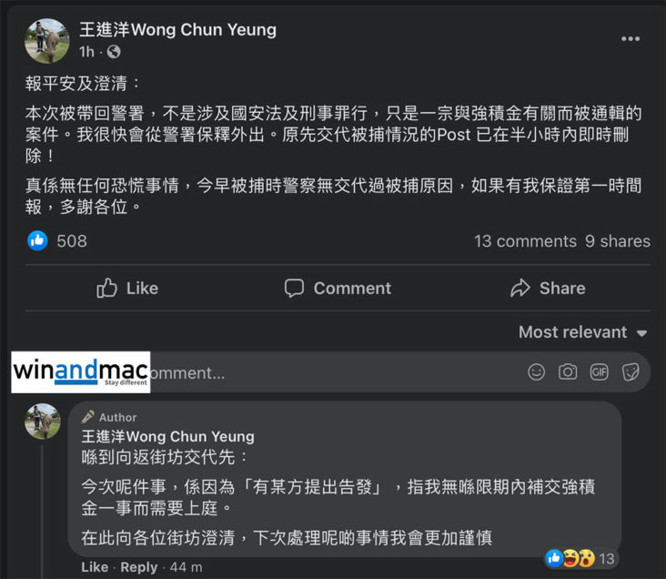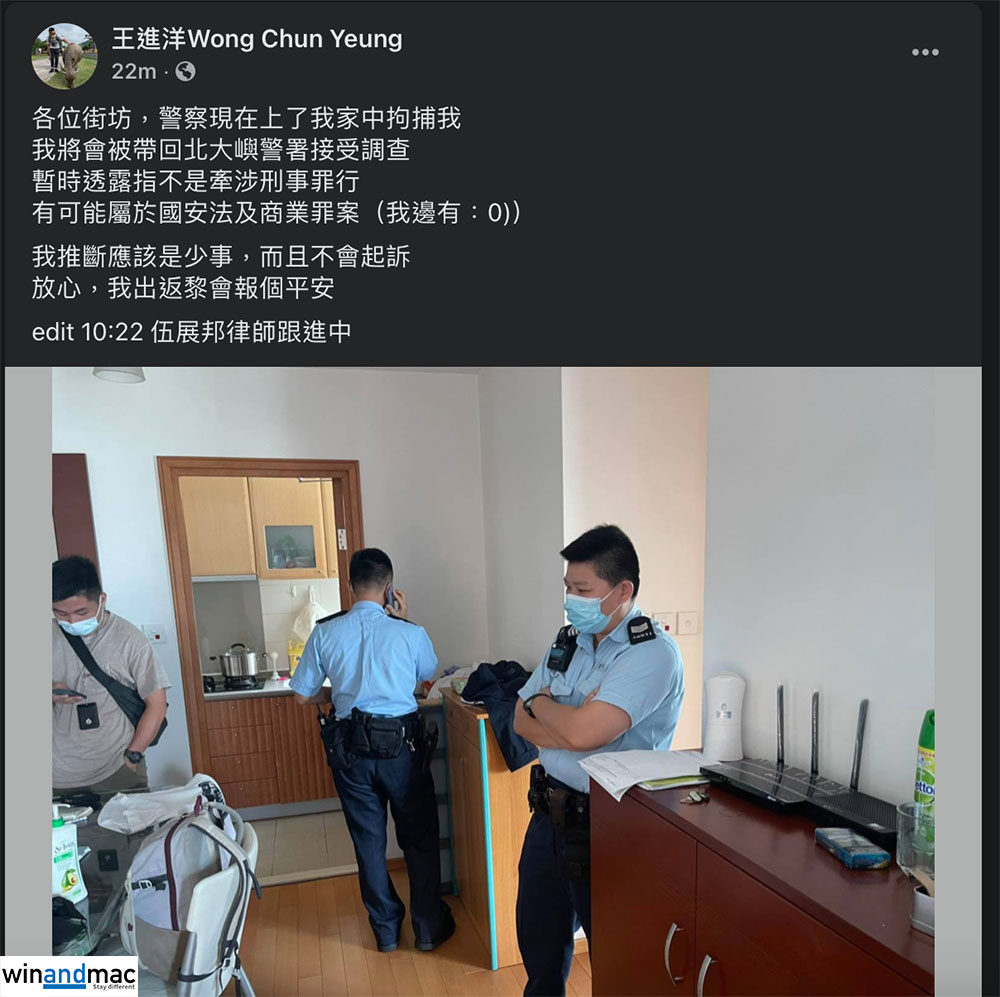 第六屆離島區議會議員王進洋,今早在社交網絡表示被警察上門拘捕。王進洋表示,警方跟他表示,暫時透露指不是牽涉刑事罪行,有可能屬於國安法及商業罪案。他目前已有伍展邦律師跟進,他自行推斷應該是少事,而且不會起訴,指出黎之後會報平安。王進洋其後刪除原文,再發表新文章,指本次被帶回警署,不是涉及國安法及刑事罪行,只是一宗與強積金有關而被通輯的案件。他很快會從警署保釋外出。王進洋進一步解釋,指係因為「有某方提出告發」,指他沒有在限期內補交強積金一事而需要上庭。由於今早被捕時警察無交代過被捕原因,如果有他保證第一時間準確報告。