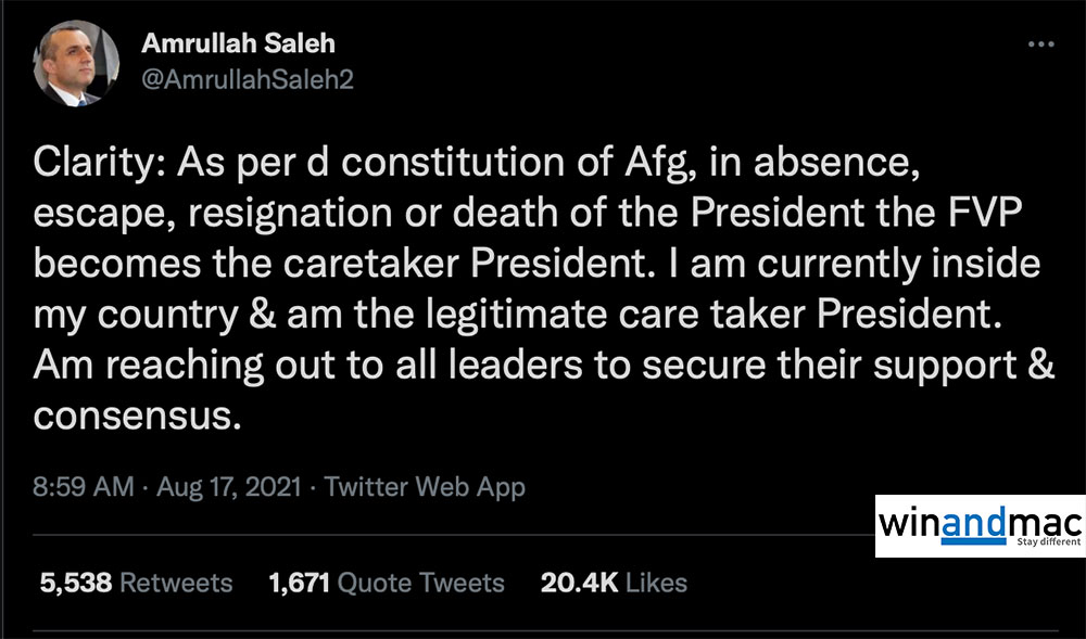 雖然阿富汗總統Ashraf Ghani已經辭職並逃離阿富汗,但其實仍有一定數量的政府人員在阿富汗境內,如副總統便是。副總統Amrullah Saleh在塔利班舉行記者會後,發表文章指澄清根據阿富汗憲法,在總統缺席、逃跑、辭職或死亡的情況下,第一副總統會成為臨時看守總統(caretaker President)。他強調自己目前阿富汗境內,是合法的看守總統。他正與所有領導人接觸,以確保他們的支持和共識。
