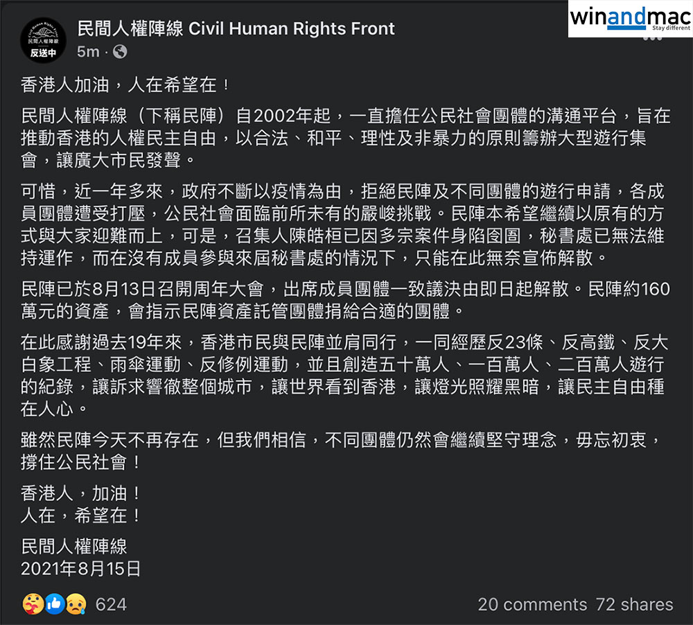 早前已有傳媒報道指,民間人權陣線(民陣)於上星期五將開會決定是否要解散。民陣剛向傳媒和公眾發出通知,正式宣佈有關解散的決定。民陣稱,近一年多來,政府不斷以疫情為由,拒絕民陣及不同團體的遊行申請,各成員團體遭受打壓,公民社會面臨前所未有的嚴峻挑戰。