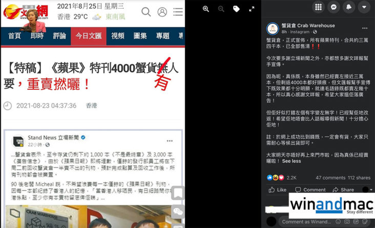 蟹貨倉早前曾提到仍有很多蘋果特刊未賣出,包括《不是最終章》有1000本以及《廣告信念》3000本。他們提到因為蘋果日報即將埋數,所以《蘋果日報》發行部員工將於星期二回收蟹貨倉一半賣不出的刊物。預計完成所有點算和回收工作後,所有刊物都會被棄置。蟹貨倉於數小時前在社交網絡正式宣佈,所有蘋果特刊,合共約34000本已全部賣完。