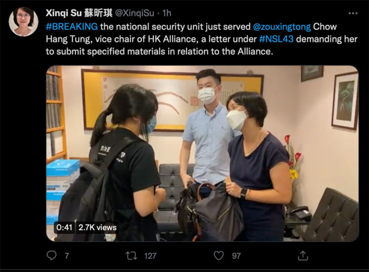 早前有報道指支聯會已通過解散,但未向外正式公佈。唯國安處今早再到支聯會副主席鄒幸彤在中環的大律師辦公室,向她提交國安處信件,信件中提到根據國安法43條實施細則,要求支聯會交出資料。據稱,其他的支聯會常委於今天也收到類似的信件,要求交出相關資料。