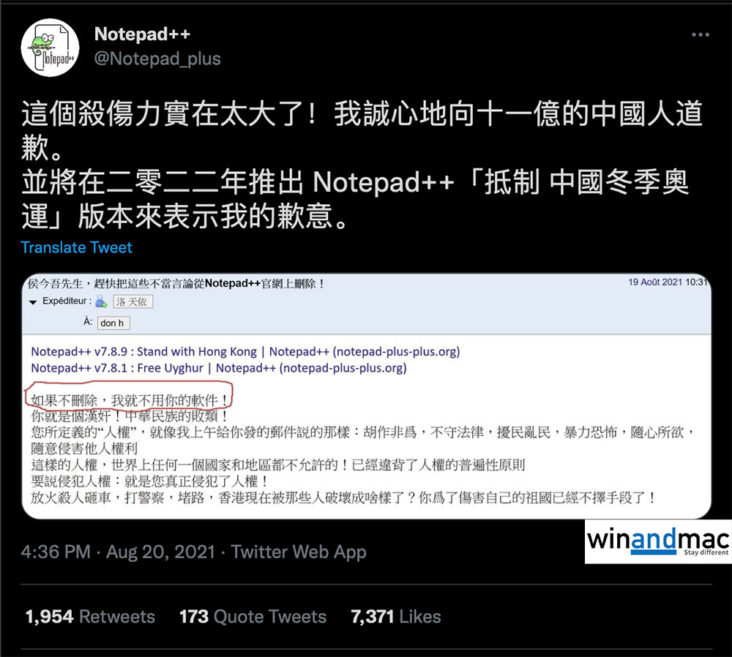 結果,Notepad++在Twitter上發表「道歉」信,串爆稱「這個殺傷力實在太大了!我誠心地向十一億的中國人道歉。並將在二零二二年推出 Notepad++「抵制 中國冬季奧運」版本來表示我的歉意。」。Notepad++作者後來稱,朋友問他如何回應中國的網軍,他指不會回覆。若回覆便把他的高度降低至與他們一樣的水平,二則他的時間寶貴有更重要的事。例如上成人網站自慰,都比回覆他們的挑釁還更有意義。