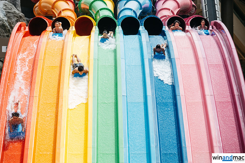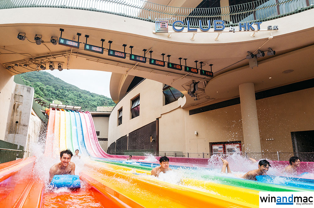 水上樂園最重點的吸引項目,或許就是八條17米高的彩虹色彩滑水道。跳入滑水道時,一開始是一片漆黑的管道,然後體驗急速飛墮,再於連串急彎中飛馳,來到中段開放式管道才重見光明,從中也可看到香港仔海峽的景色。滑水道末端設有計時器,讓市民可以與其他朋友一同比併。