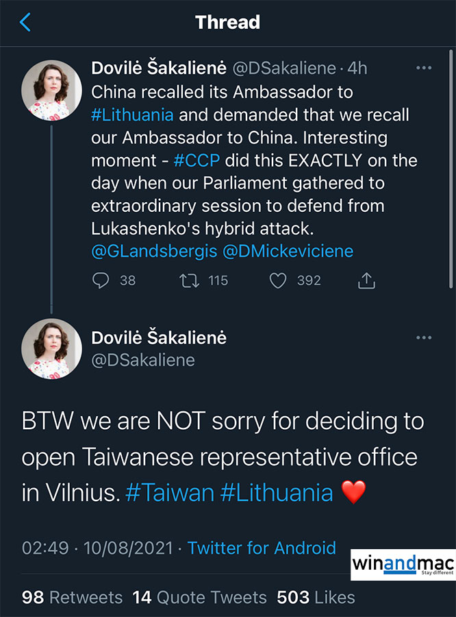 立陶宛早前允許台灣設立代表處,激嬲中國,中國連日不停反擊,要求立陶宛道歉,中國的原因當然又係話自古以來得一個中國。中國外交部當局於10日,正式宣布召回駐立陶宛大使,並要求立陶宛召回駐中國大使。立陶宛國會議員Dovilė Šakalienė在Twitter忍不住發表文章串中國,指他們對於允許台灣設立代表處事情唔會講對唔住。