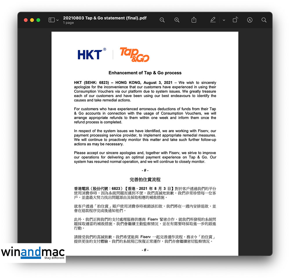 Tap & Go回應消費券扣錯錢問題  稱珍惜每一位客戶、兩度真誠地致歉