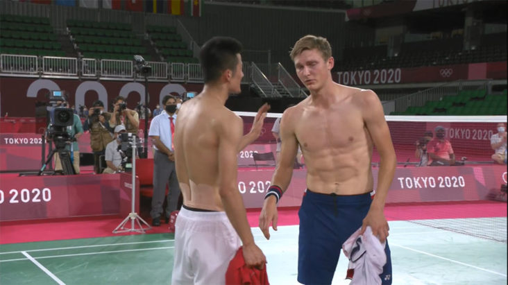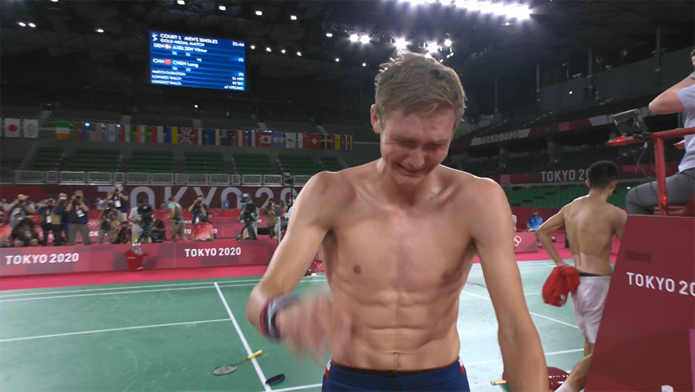 Viktor Axelsen與諶龍的對戰算是激烈,不過Viktor Axelsen一開始已經佔盡優勢,第一局以21:15勝出,第二局則以21:12再一次勝出獲金牌。在最後決勝分的時候,中國要求裁判檢查,結果Viktor Axelsen所發的球沒有出界,成功獲得最後一分贏出。Viktor Axelsen情緒激動,忍不住大哭,與教練擁抱,無法相信已勝出的事實。
