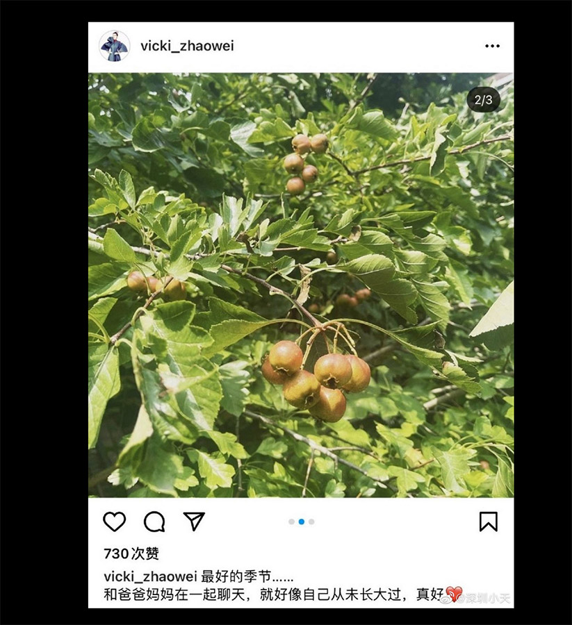 唯趙薇於當地時間29日,突然用Instagram發表多張相片,寫道「最好的季節,和爸爸媽媽在一起聊天,就好像自己從未長大過,真好」,當有人留言提到相片中的書本時,趙薇回覆稱「北京初秋,最佳閱讀時間。大自然是魔術師」,並加上微笑表情符號。但其後趙薇很快便把有關文章和相片刪除。有大陸網民看到相片後,突然當上「植物專家」,指趙薇不像在法國,有關植物像在中國境內。再加上上述提到的趙薇的回覆,似乎她暫時未有離開中國。