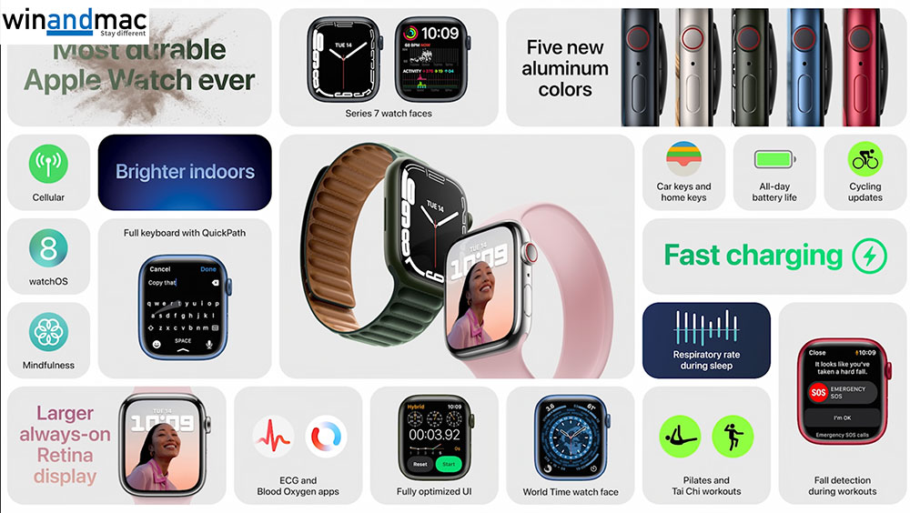 蘋果也加強Apple Watch Series 7螢幕的防刮花表現,而且亦支援防塵標準IP6X。其售價由US$399起跳,有五種顏色選擇,並將於今年秋季稍後時間開售。