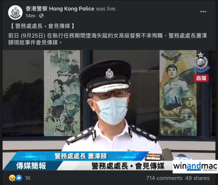 日前於執勤時墮海失蹤的女警高級督察林婉儀,警方於數小時前在二澳一帶發現一具屍體,證實就是林婉儀。警方其後舉行記者會,警務處處長蕭澤頤表示警隊上下感到非常痛心,並希望向婉儀屋企人致以最深切慰問,並會給予最適切的支援。警隊社交網絡專頁也轉用黑白logo表示悼念。