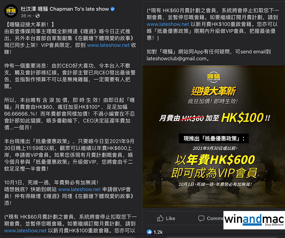 杜汶澤喱騷早前宣佈集合了前壹傳媒員工,於9月1日推出新版面「喱週」,另外他們早前亦拍攝了劇集《在觀塘下體現愛的故事》亦同樣會在9月1日上架。就在今天多了內容睇的時候,喱騷宣佈由即日起月費將由原本的HK$60加至HK$100,加幅超過66.6%,而年費亦會加價。喱騷解釋指,這是因為CEO好大喜功,令其入不敷支,觸及會計部條紅線,又「指製作預算不可以是無掩雞籠」,唯有「含淚加價即時生效」。
