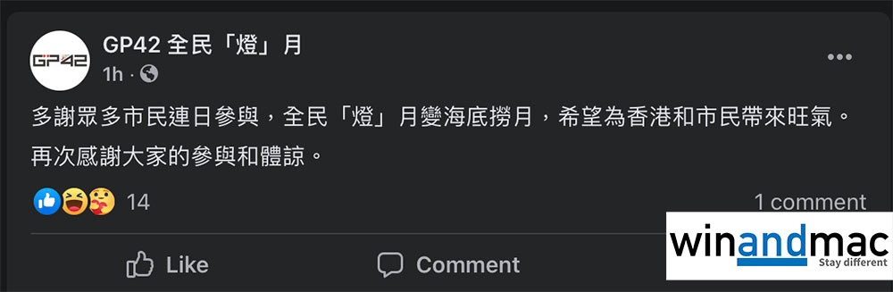 其後他們也在社交網絡中,稱多謝眾多市民連日參與,全民「燈」月變海底撈月,希望為香港和市民帶來旺氣,亦再次感謝大家的參與和體諒。