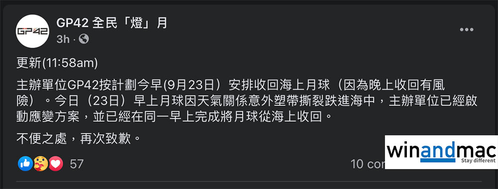數小時前,有市民拍到觀塘海濱巨型發光月亮跌咗落海,全城熱話。不少網民稱見到爆開的「月亮」後想起打邊爐「生筋」,大叫肚餓。主辦單位GP42其後也在社交網絡交待事件,稱他們原定在昨晚活動完成後收起月球,但因晚上收回有風險,所以決定今早才收回月球。唯早上月球因天氣關係,塑帶意外地撕裂,令月球跌進海中,主辦單位已經啟動處理方案,盡快將月球撈回海面處理。GP42回應本站記者查詢時,提到已經在同一早上成功將月球從海上收回,並會按原定計劃將物料作升級改造,保護環境及提升社會效益。