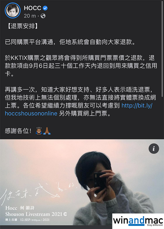 何韻詩的團隊已與購票平台溝通,於KKTIX購票之觀眾將會得到所購買門票票價之退款,退款款項由9月6日起三十個工作天內,自動退回到用來購買之信用卡。他們稱各位希望繼續力撐的朋友,可以考慮到 http://bit.ly/hoccshousononline 另外購買網上門票。