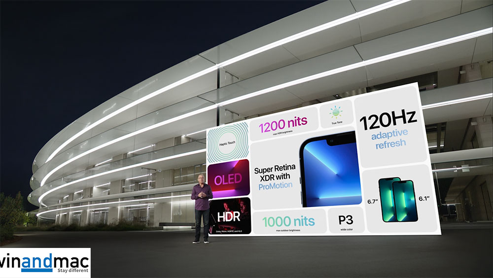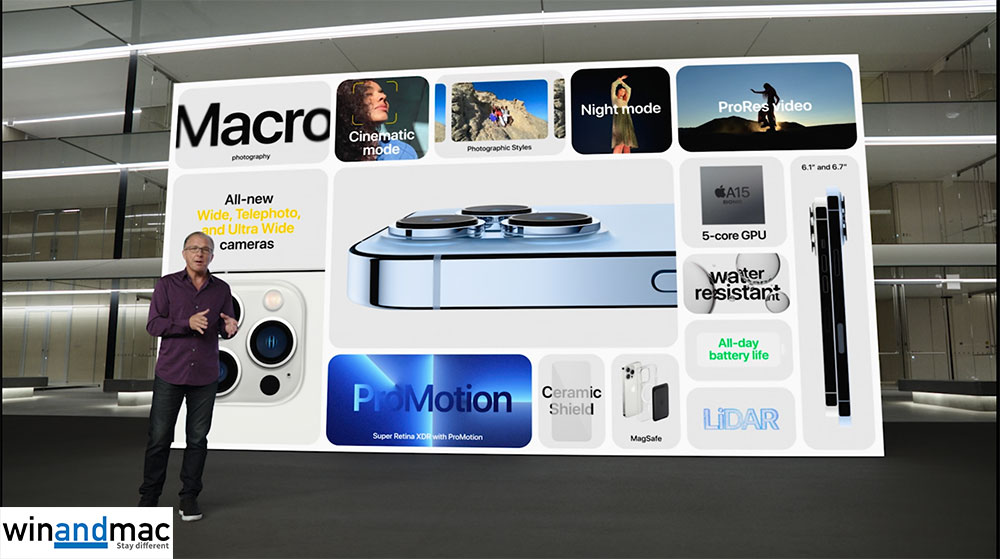 除了較基本的iPhone 13型號外,蘋果也發佈了iPhone 13 Pro。外型上與iPhone 12 Pro基本上無分別,不過一如早前傳言所述,機身前方的M字額縮細了20%。iPhone 13 Pro也像iPhone 13一樣,使用A15晶片,Pro版更有多達5個GPU核心。iPhone 13 Pro的螢幕也有改善,終於支援不少高階Android手機已有的120Hz。