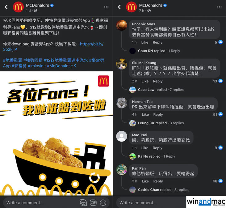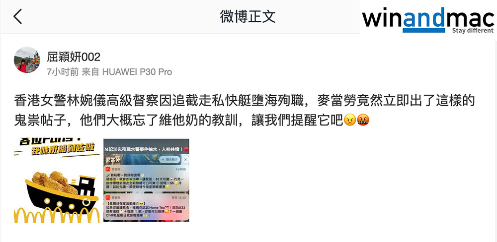 執勤時墮海失蹤的女警高級督察林婉儀,於數小時前其屍體出現,證實死亡。「跌咗嘢唔好搵,就會走返出黎」一直為部份網民意見,但對於撐警人士來說,則十分不滿。沒想到,數小時前網傳香港麥當勞突然發出一個推播訊息,標題為「跌咗嘢~就係咁出奇」,內部第一句已經寫住「唔搵佢,就會走返出黎」。