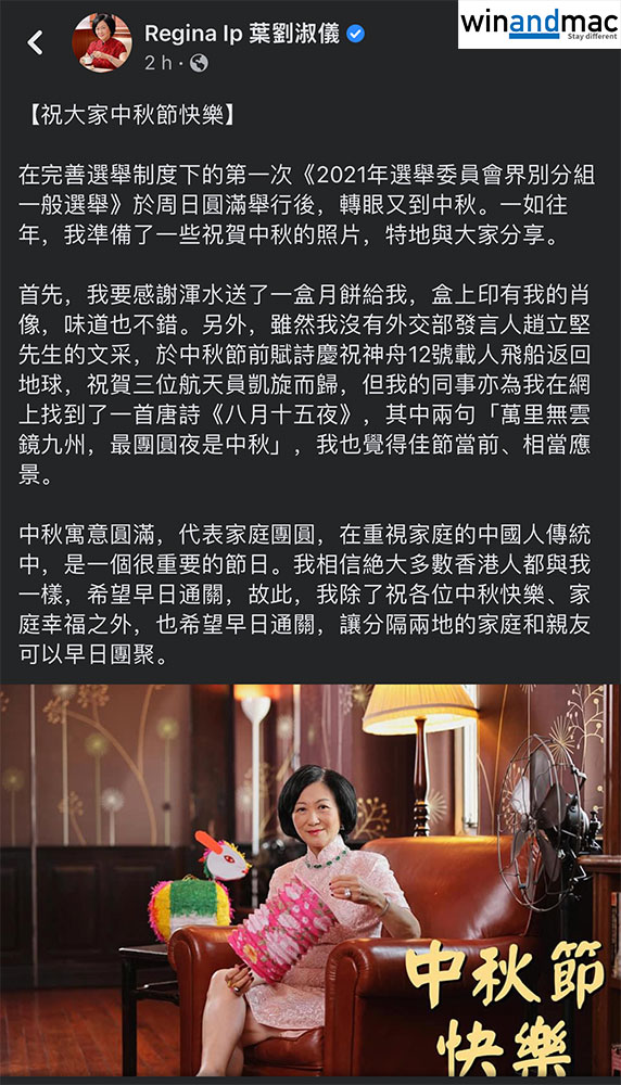 她最後提到,大多數香港人都與她一樣希望早日通關。故此,她除了祝各位中秋快樂、家庭幸福之外,也希望早日通關,讓分隔兩地的家庭和親友可以早日團聚。