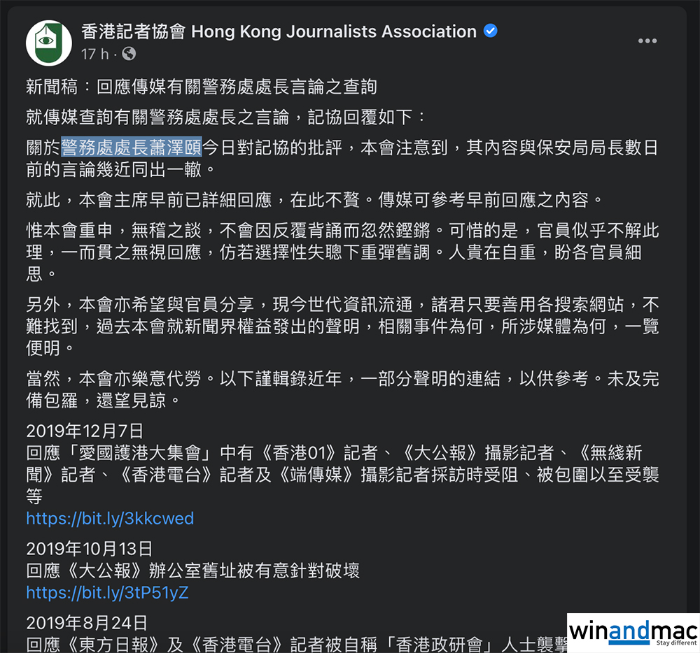 翻查資料,記協過往多次聲明中,多次為立場明顯親中的無綫新聞、香港01、甚至乎黨報大公報、環球時報、文匯報等採訪時受阻的事件,發表多次聲明譴責。當時亦有不少人批評記協為什麼要幫黨報或紅媒發聲。