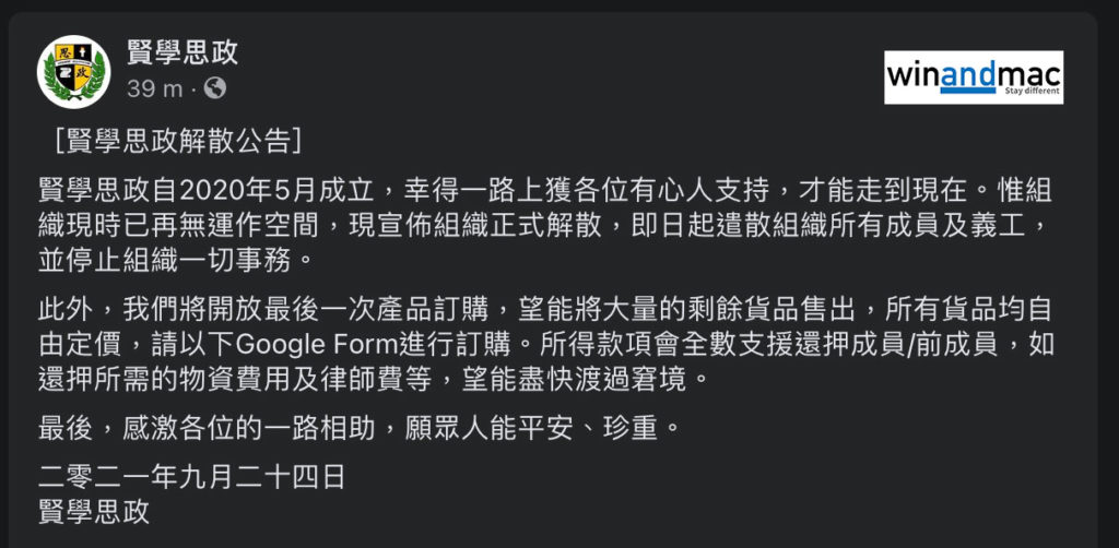突發:賢學思政宣佈解散  稱已再無運作空間