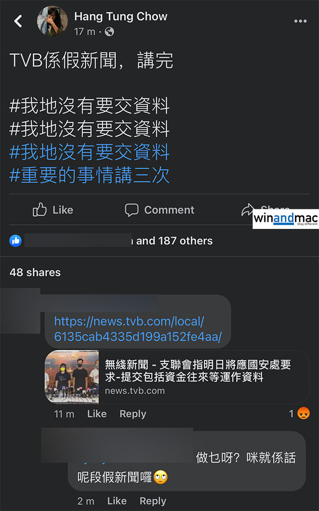 支聯會昨天舉行記者會,副主席鄒幸彤霸氣稱「我哋唔會幫你散播恐懼」,表明拒絕提交資料,強調他們不是任何國家或團體的「代理人」,警方無相關權力要求交資料。數分鐘前,無綫新聞突然有一篇報道,題為「支聯會指明日將應國安處要求-提交包括資金往來等運作資料」,似乎想暗示支聯會短時間內跪低。可是,鄒幸彤極速在社交網絡回應,指「TVB係假新聞,講完」,並重複三次,表明沒有要交資料。她其實已向傳媒回應,稱信件僅為回信,內容只係講番點解支聯會唔交資料,並非跪低。
