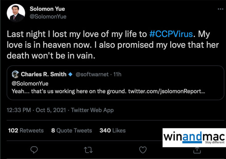 曾多次為香港發聲的美國共和黨政治人物Solomon Yue俞懷松,於數小時前在Twitter上宣佈,昨天晚上其太太因為感染「中共病毒」而去世。他在Twitter上表明,已承諾自己所愛的人,不會讓她白白犧牲(her death won’t be in vain)。不少香港網民都在Twitter向他表達關心。