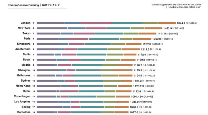 日本研究機構森記念財團The Mori Memorial Foundation最近公佈最新2021全球最具吸引力城市指數排名,香港由原本在第9位,跌至第13位,亦即首次十名不入。有關評分無提到港區國安法,但評分指標包括經濟、開發、文化交流、居住、環境、交通等70多項而得出,有一定的代表性。