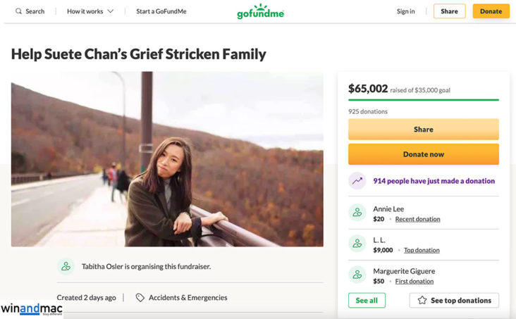 Suete Chan在加拿大擔任時裝公司市場經理,其僱主Tabitha Osler得悉事件後,在網上發起眾籌,希望熱心人士能幫助其在香港的年老家人到加拿大辦理Suete的身後事。Tabitha形容Suete有冒險精神,即使適應新生活充滿挑戰,也勇於面對,可惜生命旅途突然被中斷。有關眾籌目標為加幣$35000,日前已經超額完成,籌得加幣$65002。