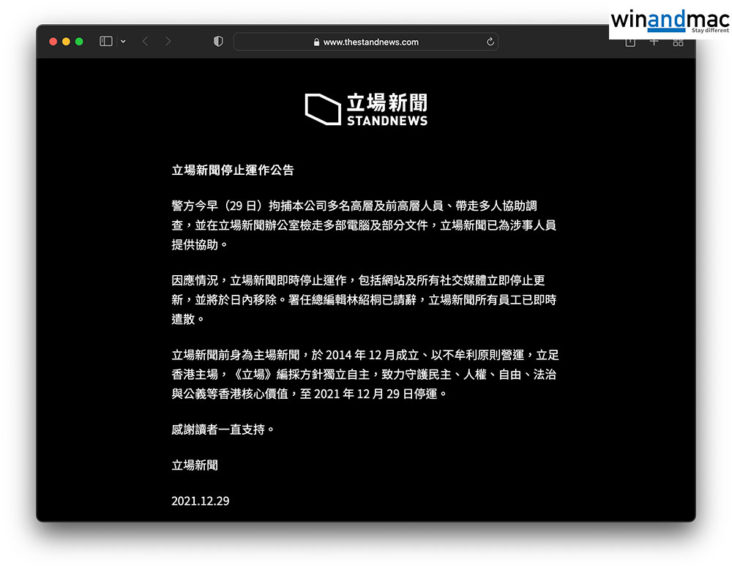 上一次蘋果日報被港共政權強制關閉前,都有數天時間,網民還有空間自行召集進行備份。日前立場新聞被國安處大搜捕後,立場新聞於日前約11pm左右就把所有內容移除。立場新聞過往過百萬的社交網絡專頁等,帳號已被刪除,而官方網站只顯示上述通知,其餘內容已無法瀏覽。