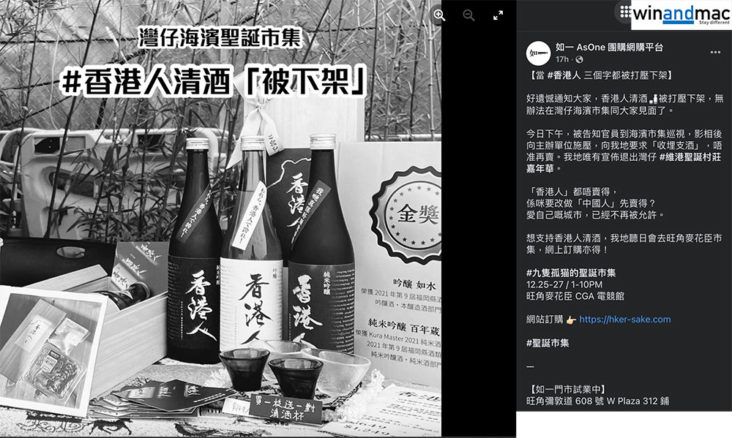 自從國安法實施後,有人曾經擔心日後自稱「香港人」是否都會犯法,應該要叫「中國人」先可以。如一AsOne團購網購平台最近參加灣仔的維港聖誕村莊嘉年華時,於昨日下午被告知官員到海濱市集巡視,影相後有人向主辦單位施壓,向他們要求收起名為「香港人」的清酒,唔准再賣。如一表示,唯有退出有關嘉年華。