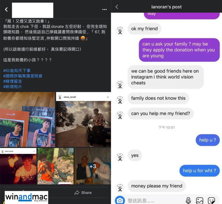 可是,在最近收到報告的時候,發現小朋友的樣子比他更大。該網民看到有全名提供,於是決定上Instagram搜尋,結果一搵之下,「發現唔多對路」。因為該「小朋友」又煙又酒又跑車,生活似乎比更多人都更好。該名網民更主動進行調查,在Instagram去問該位「小朋友」一些事情。該名「小朋友」直言world vision cheats(世界宣明會欺騙),又指其家人不知情。搞笑的是,該名小朋友到最後竟要求網民事主拎錢,寫道「money please my friend」。