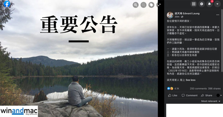 公告中亦提到,將遵照法律意見,於明日(2022年1月19日)凌晨零時停止運作並移除梁天琦社交網絡所有內容,以保障天琦。