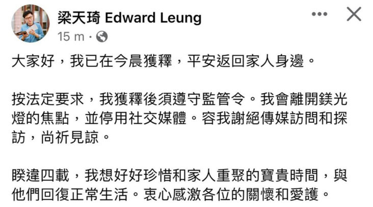 本土派梁天琦已於今天零晨2:40分左右獲釋,他其後已經回家。據消息稱,當局和梁天琦本人意願,故此安排在零晨離開監獄。梁天琦曾短暫在社交網絡報平安,稱已平安返回家身邊。他提到獲釋後需遵守監管令,他本人亦選擇離開鎂光燈的焦點,除了不接受傳媒訪問和探訪外,也會停用社交媒體。