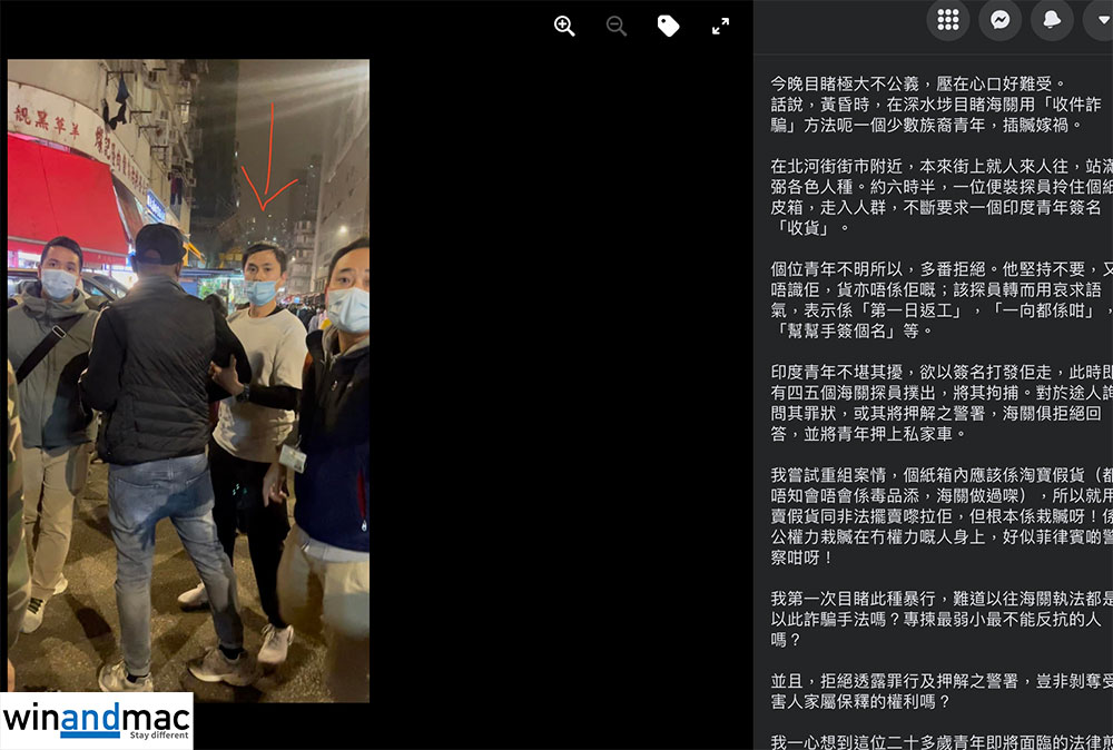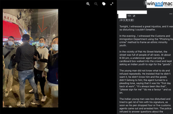 數小時前,一名網民在網上發表文章,表示在深水埗目賭極大不公義,壓在心口好難受。該名網民表示,親眼看到一位便裝探員拎住紙皮箱,走入人群,不斷要求一名印度青年簽名「收貨」。據稱現場當時有很多少數族裔青年,而該名印度青年不明所以,故此多次拒絕。網民述「他堅持不要,又唔識佢,貨亦唔係佢嘅」。網民稱,當時聽到該名便裝探員提到「第一日返工」,「一向都係咁」,「幫幫手簽個名」等。