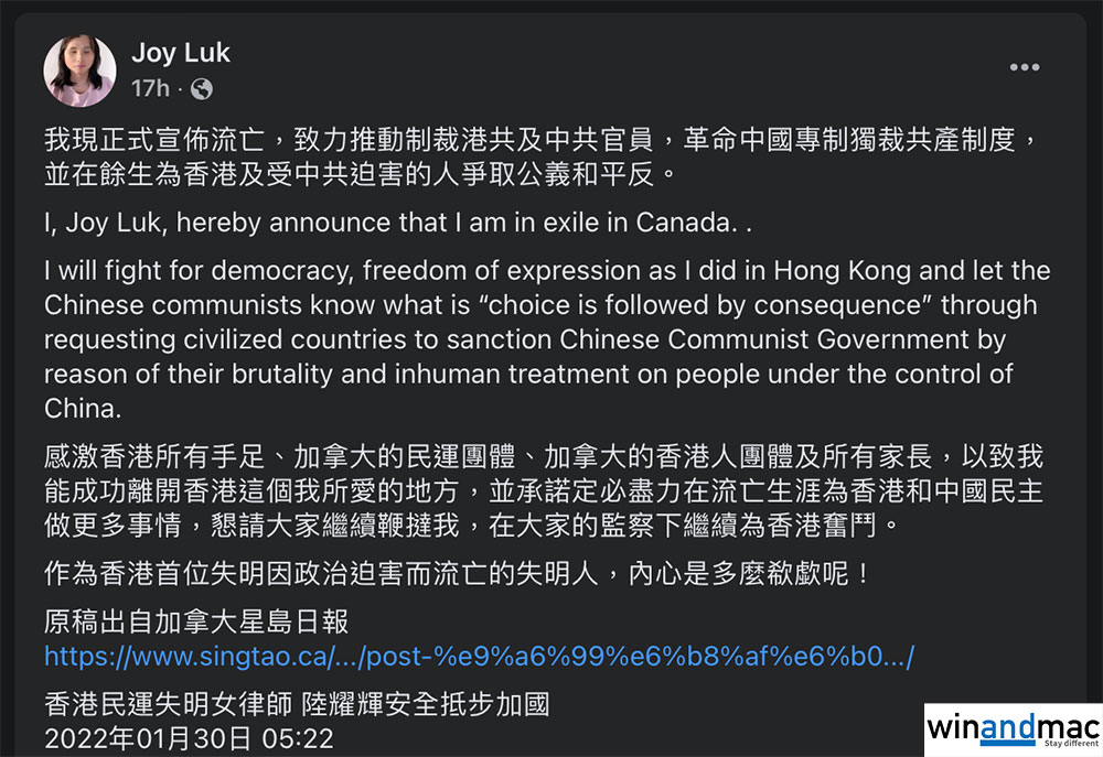 為香港民運而努力、去盡抗爭現場的失明律師陸耀輝Joy Luk,於數小時前在社交網絡上宣佈正式流亡加拿大。她表明,致力推動制裁港共及中共官員,革命中國專制獨裁共產制度,並在餘生為香港及受中共迫害的人爭取公義和平反。她接受加拿大星島日報訪問時,提到在香港時經常被警察跟蹤,就算是上月出發去加拿大時,在香港過海關時遇到障礙,出示身份證後曾等候10多分鐘才獲放行,她個人估計關員是查證她能否離港。