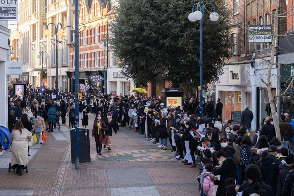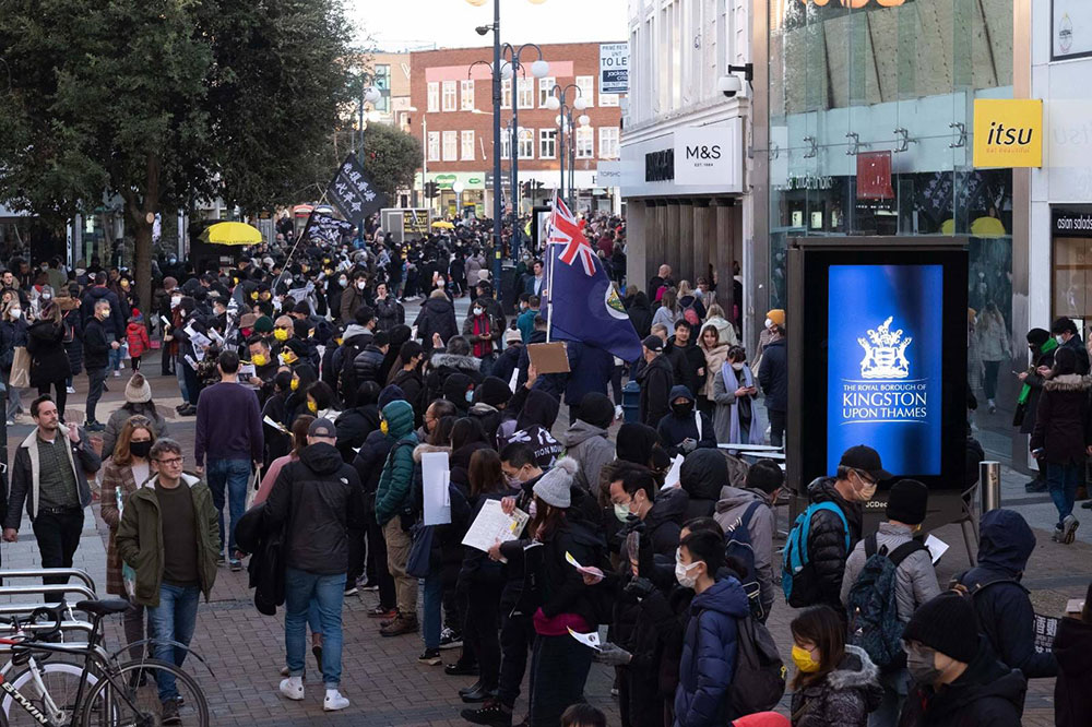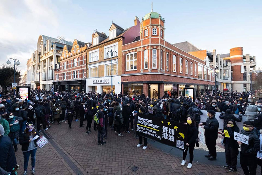 要在香港看見人鏈示威活動已經不太可能,在英國時間星期日,在各地的香港人走上街頭為香港發聲,包括倫敦Kingston、伯明翰、Bristol和曼徹斯特Manchester等。其中Kingston UK HKers Stand with Hong Kong組織,於Kingston的舉行示威,在Clarence Street市中心築起人鏈,場面十分壯觀。參加的人除了拿起光復香港的旗幟外,也有文宣提到香港《立場新聞》等被打壓的情況,以及印有前《立場新聞》記者何桂藍、何韻詩肖像、眾新聞、支聯會副主席鄒幸彤等文宣。活動當日亦有香港人,向途人講述香港目前的情況。參加者在現場亦高呼大家熟識的抗爭口號,並有不少人持有「加油」等標語到場。