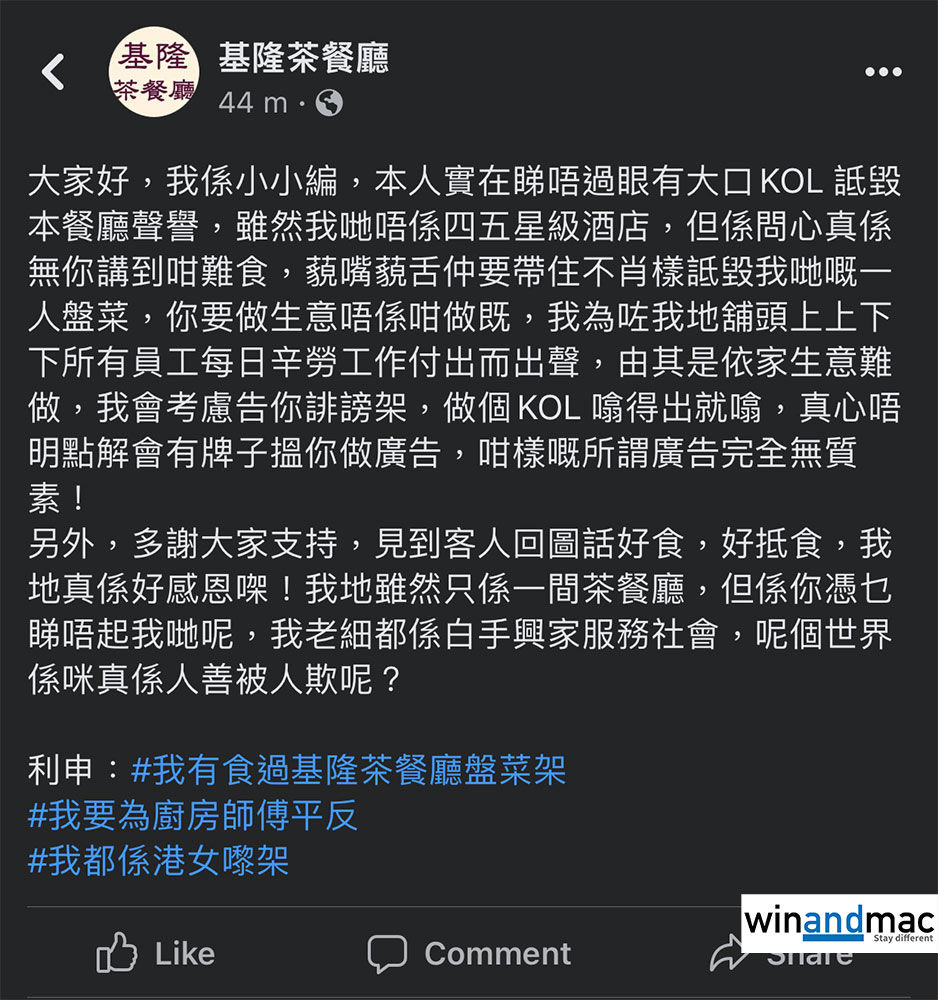 基隆茶餐廳於今天在社交網絡回應事件,表明「依家生意難做,我會考慮告你誹謗架,做個KOL噏得出就噏」。他們稱自己雖然不是四五星級酒店,但「問心真係無你講到咁難食」,並指「睇唔過眼有大口KOL詆毀本餐廳聲譽」。