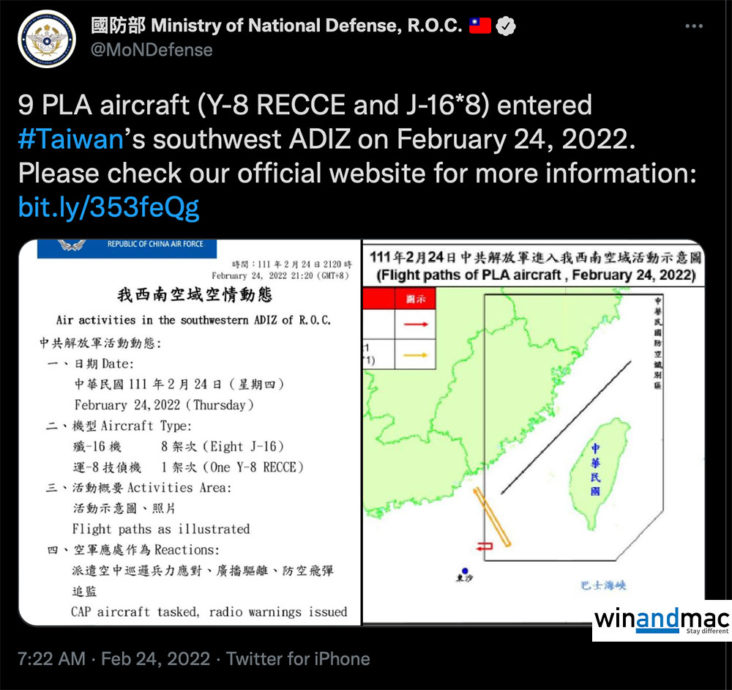 根據台灣國防部與路透社報道,日前烏克蘭被俄羅斯入侵的時候,中國共產黨的軍機再一次飛入台灣防空識別區。正如早前不少傳媒報道,這也不是第一次中共軍機擾台,唯日前局勢敏感,有評論擔心中國與俄羅斯兩大極權國家本是好友,會互相配合入侵其他國家領土。據稱,今次中共軍機擾台的規模也是最大。
