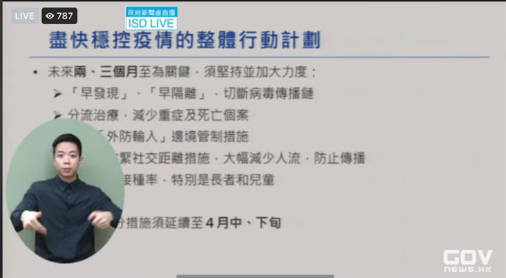 林鄭強調在這兩三個月要早發現和早隔離,切斷病毒傳播。在記者會一開始前,林鄭用了極多時間,不停感謝中央幫忙和協助。