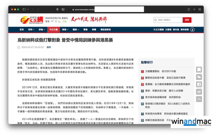在大陸黨媒為了仍身在烏克蘭的中國人的安全,近日急改口風稱戰爭嚴肅的時候,香港文匯報於日前竟然發表文章,仍大力批評烏克蘭,還把烏克蘭拉到與香港抗爭活動有關。文匯報以標題「烏新納粹成俄打擊對象 曾受中情局訓練參與港黑暴」報道,內文仍然合理化俄羅斯入侵行動,指只是為了保護8年來遭受基輔政權虐待、種族滅絕的人民。他們形容烏克蘭有「納粹份子」,更斥這些人過往曾參與香港「黑暴」事件。